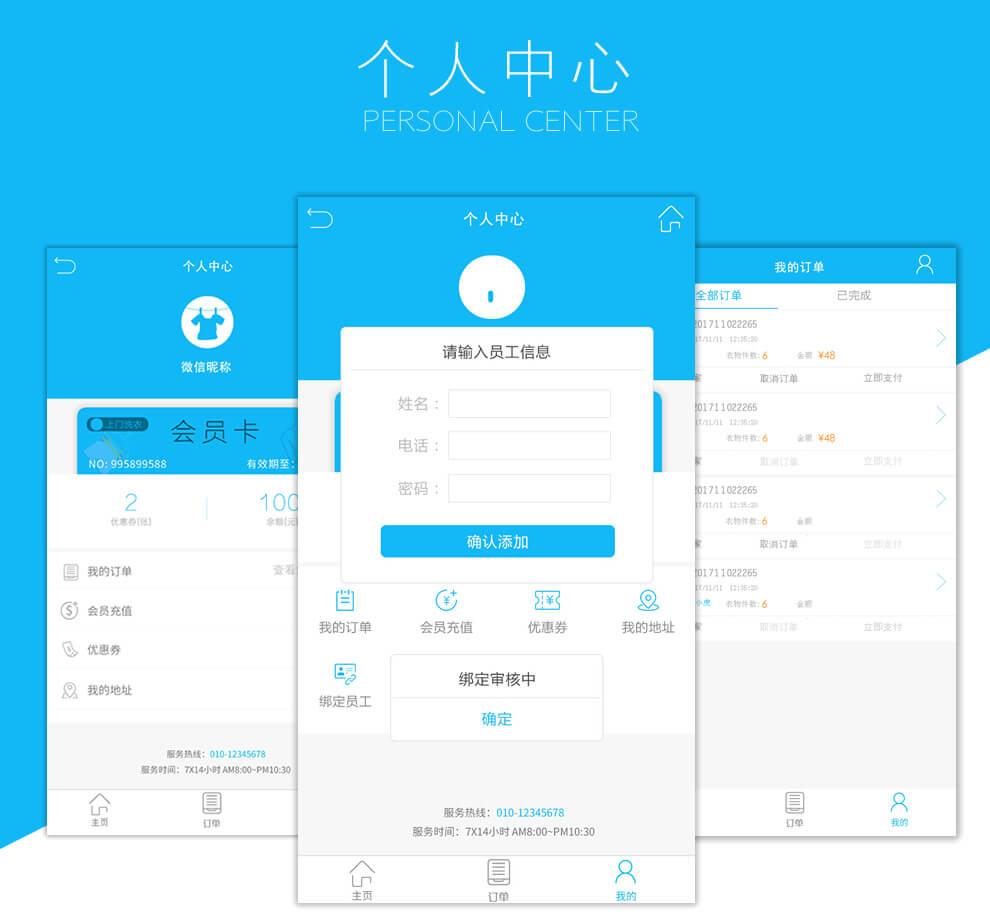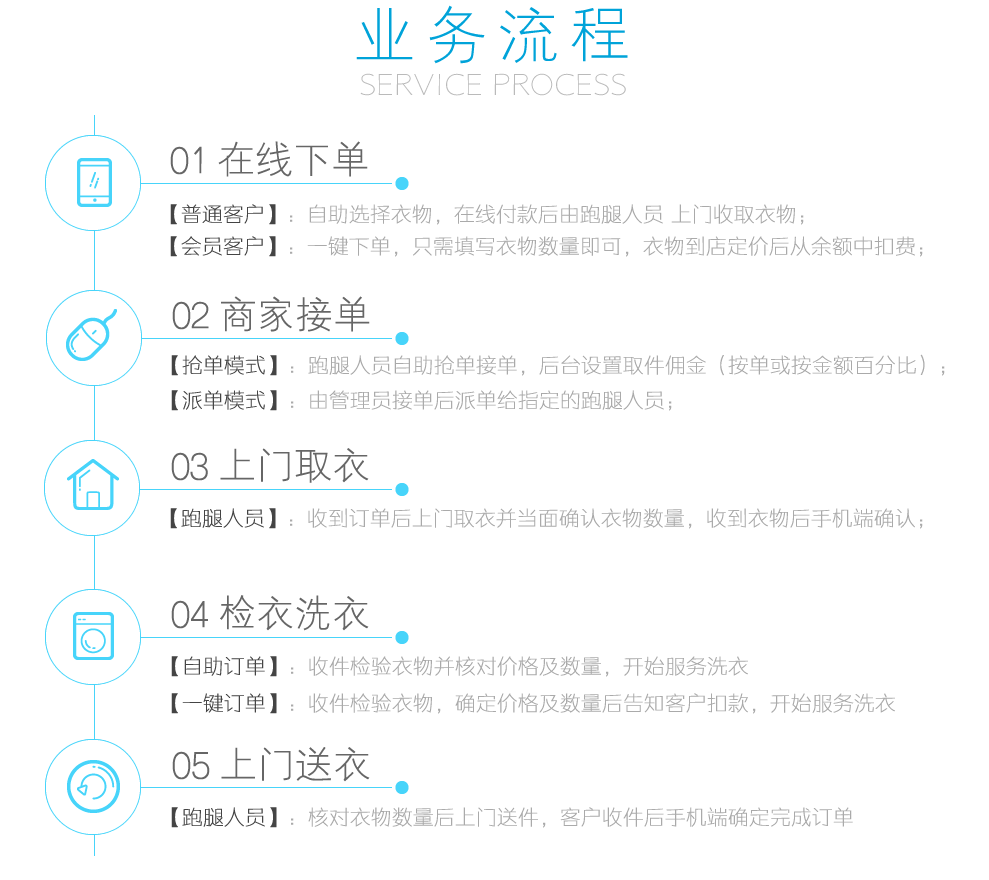 在线下单、商家接单(抢单、接单)、上门取衣、检衣洗衣、上门送衣、优惠卷、跑腿功能、会员卡系统(充值、支付)、留言系统、管理员手机端(跑腿人、检验人、管理员)、短信、模版消息、订单动态、订单自动打印、主题切换